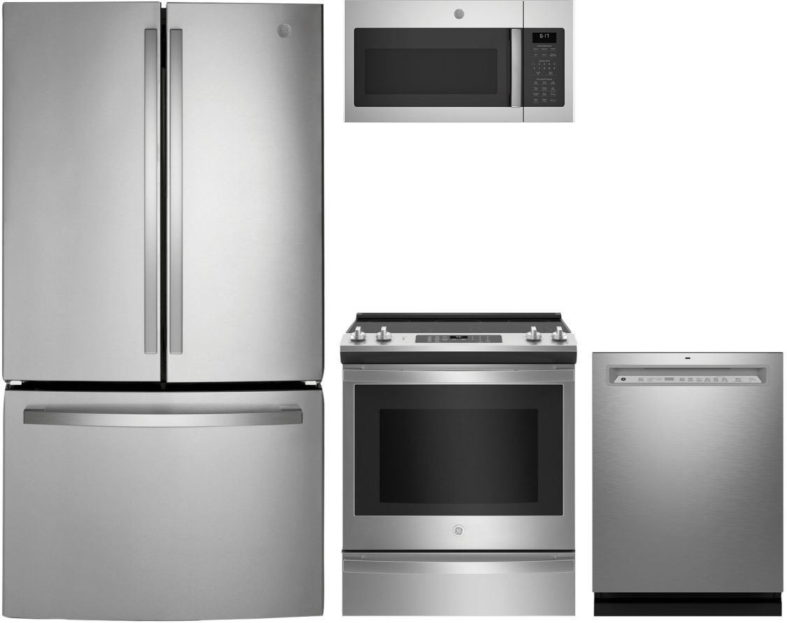 GE® 4 Piece Stainless Steel Kitchen Package with French door refrigerator, slide in electric range, built in dishwasher and over the range microwave.Read More