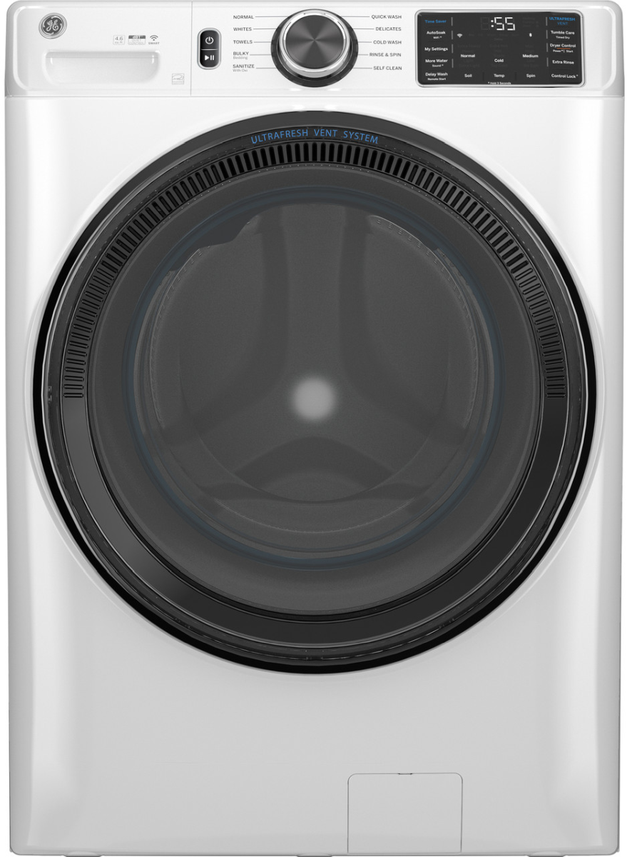 GE® 4.6 Cu. Ft. White Front Load Washer features Dynamic Balancing Technology (dBT™), Dryer Control™, Built-in WiFi, Microban® antimicrobial technology, UltraFresh Vent System With OdorBlock™, Quick Wash Cycle, and Reversible Door.Read More
